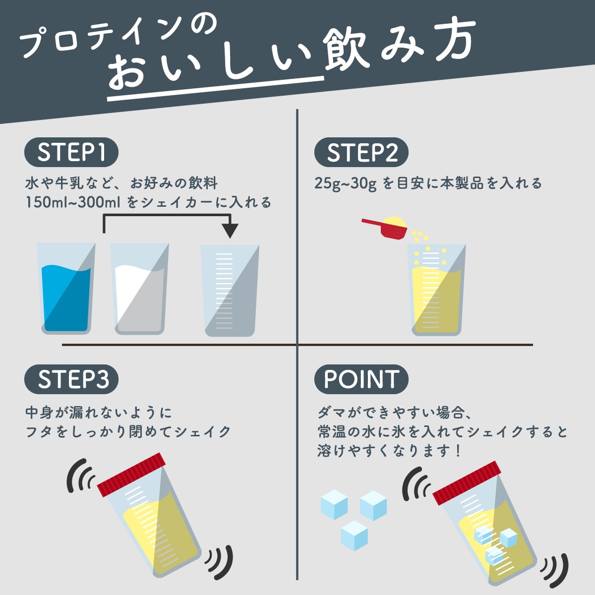 25g~30g程度を150~300ml程度の水やお好きな飲料に混ぜてお召し上がりください。